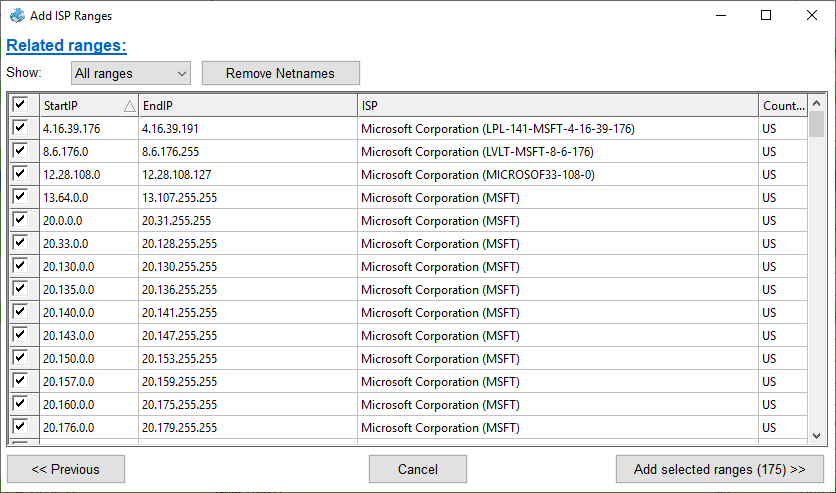 In the related ranges view, you can show and select all ranges, parent only or small only (more specific ranges)